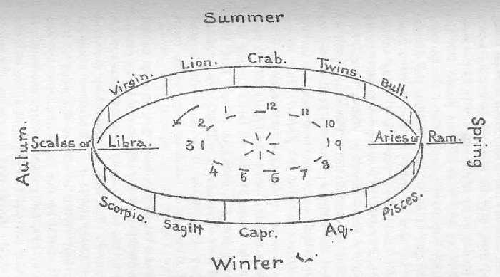 | In the above illustration the signs of the Zodiac are represented by a belt which must be imagined at a practically infinite distance among the stars. The Sun is in the centre, and the dotted circle indicates the Earth's orbit - the numerals I, 2, 3, etc., standing for the places of the Earth in the corresponding months of the year. Thus in January. to the observer at (I) the sun would appear to be in Aquarius; in February he would appear in Pisces; in March in Aries; and so forth. The diagram shows these relative positions fairly accurately as they were 3,000 years ago. Now, owing to "Precession," the place of the Spring Equinox has moved to the right, and is in Pisces, and not far from Aquarius. |