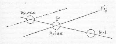 Now we have already mentioned that in the Mithra cult the slaying of a Bull by the Sungod occupies the same sort of place as the slaying of the Lamb in the Christian cult. It took place at the Vernal Equinox and the blood of the Bull acquired in men's minds a magic virtue. Mithraism was a greatly older religion than Christianity; but its genesis was similar. In fact, owing to the Precession of the Equinoxes, the crossing-place of the Ecliptic and Equator was different at the time of the establishment of Mithra-worship from what it was in the Christian period; and the Sun instead of standing in the He-lamb, or Aries, at the Vernal Equinox stood, about two thousand years earlier (as indicated by the dotted line in the diagram), in this very constellation of the Bull. (Footnote 4) The bull therefore became the symbol of the triumphant God, and the sacrifice of the bull a holy mystery. (Nor must we overlook here the agricultural appropriateness of the bull as the emblem of Spring-plowings and of service to man.)